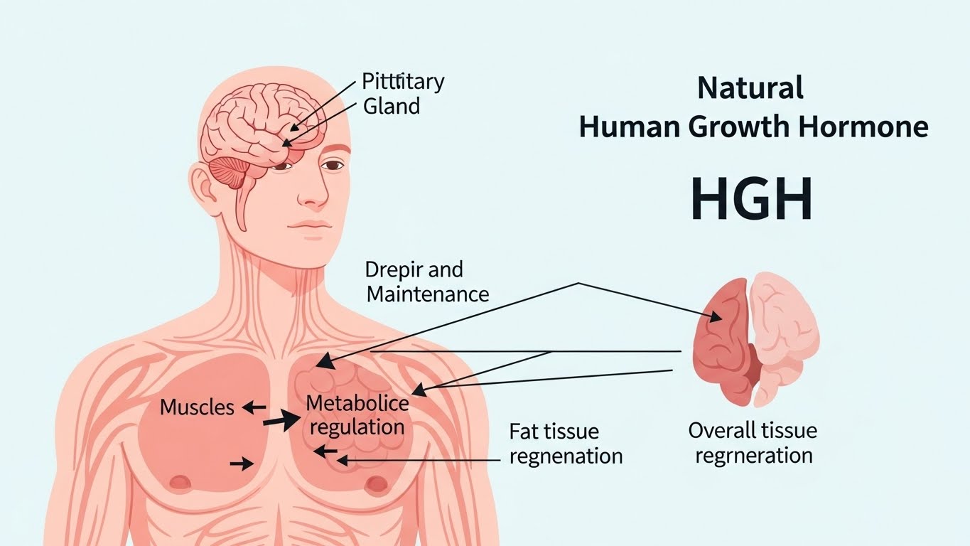 Human Growth Hormone is naturally produced by the pituitary gland and is responsible for growth, tissue repair, and metabolic regulation. During youth, HGH levels are naturally high, which supports muscle development, recovery, and fat control. As people age, HGH production declines, often leading to slower recovery, increased fat storage, and reduced muscle mass.
