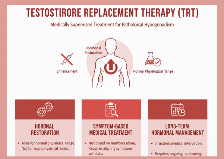 Testosterone Replacement Therapy is a medically supervised treatment used to correct pathologically low testosterone levels, not to enhance normal hormone function. It is prescribed only after a proper diagnostic evaluation confirms hypogonadism.
